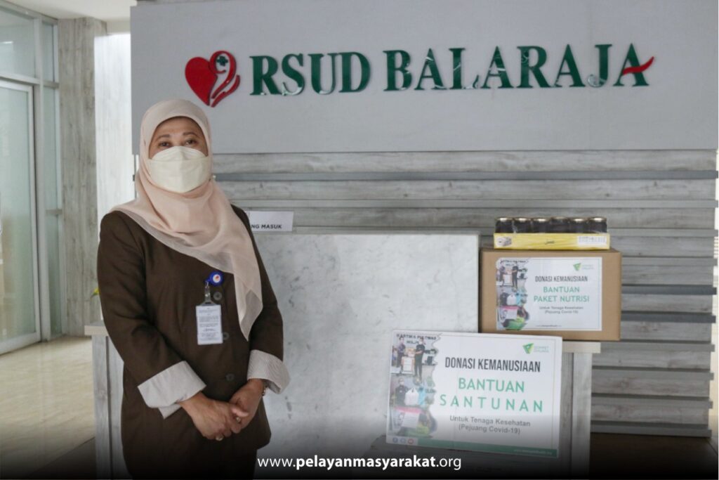 Wakil Direktur Administrasi Umum dan Keuangan RSUD Balaraja, Dra Hj. Tasnim Widarsini memberikan apresiasi atas upaya Dompet Dhuafa dalam memberikan santunan dan bantuan paket nutrisi kepada tenaga kesehatan yang berjuang merawat pasien terkonfirmasi Covid-19 di RSUD Balaraja.