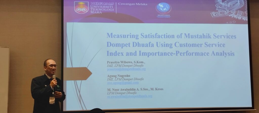 Dompet Dhuafa sebagai salah satu peserta konferensi ini mengirimkan 7 orang delegasi, diantaranya adalah dari Lembaga Pelayan Masyarakat (LPM) Dompet Dhuafa. Lembaga organ dari Dompet Dhuafa ini menugaskan Kepala LPM, Moh. Noor Awaluddin Asjhar, S,Sos., M.Kesos, untuk menyampaikan hasil riset kepuasan mustahik yang dilakukan pada awal Januari lalu, dengan paper yang berjudul “Measuring Satisfaction of Mustahik Services Dompet Dhuafa Using Customer Satisfaction Index and Importance Performace Analylis.†Paper ini juga sudah di submit untuk bisa diterbitkan dalam jurnal ERA.